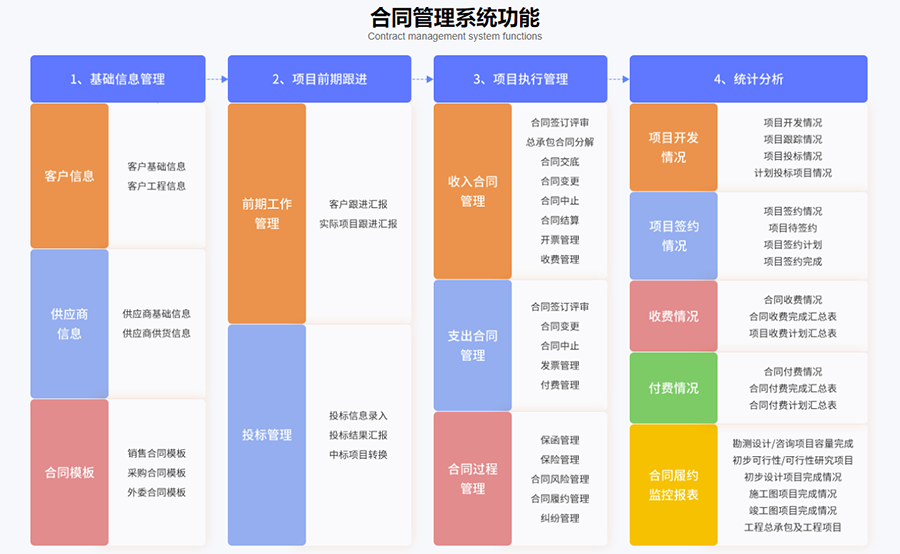 合同管理系統(tǒng)是企業(yè)為實(shí)現(xiàn)合同全過程管理而進(jìn)行的管理信息系統(tǒng)的一種。在合同的全過程管理中,包括對(duì)合同進(jìn)行立項(xiàng)、審查、審批、簽訂、執(zhí)行以及對(duì)合同的跟蹤和監(jiān)控等。該系統(tǒng)包括了合同立項(xiàng)、審批、簽訂、履行、變更以及歸檔等全過程的信息。博奧智能合同管理系統(tǒng)可以為企業(yè)提供全面而準(zhǔn)確的企業(yè)業(yè)務(wù)流程,可以對(duì)企業(yè)的業(yè)務(wù)流程進(jìn)行全面的數(shù)據(jù)分析,并能夠幫助企業(yè)輕松地對(duì)其業(yè)務(wù)流程進(jìn)行優(yōu)化,以提高整體業(yè)務(wù)的效率。